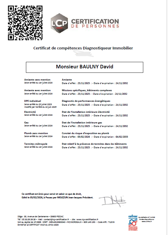 Nous sommes certifiés pour les diagnostics suivants DPE, Electricité, Gaz, Plomb, Termites, Amiante. Nous sommes certifié par LCP (La Certification à la Personne).
